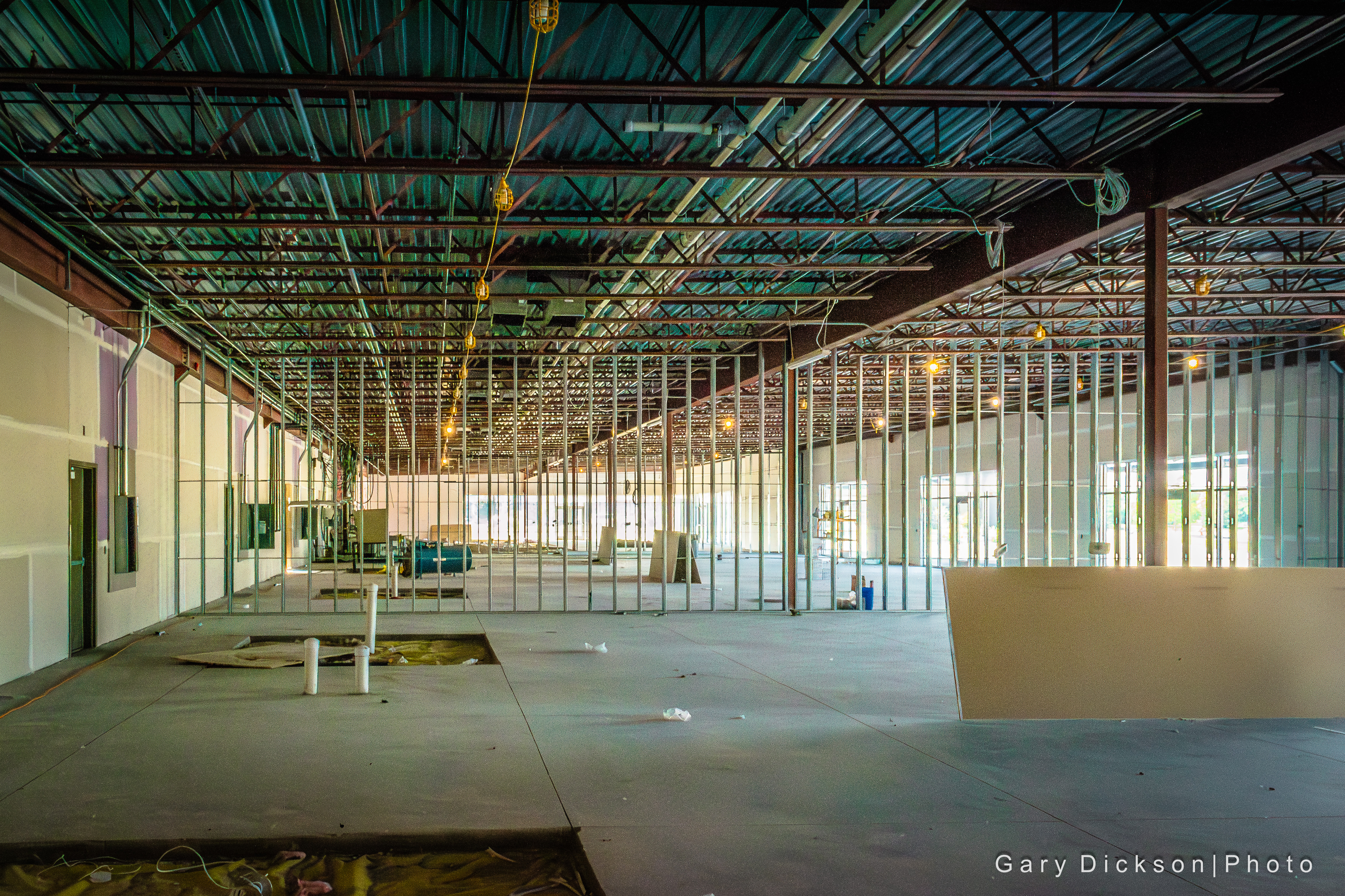 Inside there was mostly an empty, cavernous building. The cords were connected to some work lights strung through the rafters. Two metal stud walls were up, but that was it. There was no hint of any other type of construction going on in there. I took my photos and left.
