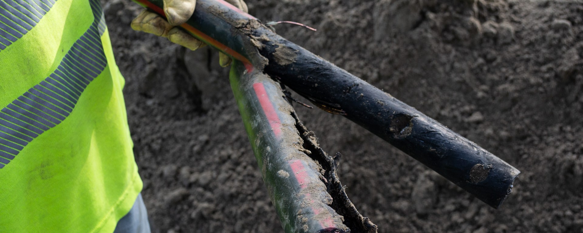 “It should take us about two hours to repair this,” said MidAmerican Energy worker Phil McKee who was working to find the damaged conduit along with two other workers. Once the damaged electrical cable was located, the crew used an excavator to carefully dig a trench to reach it several feet underground.