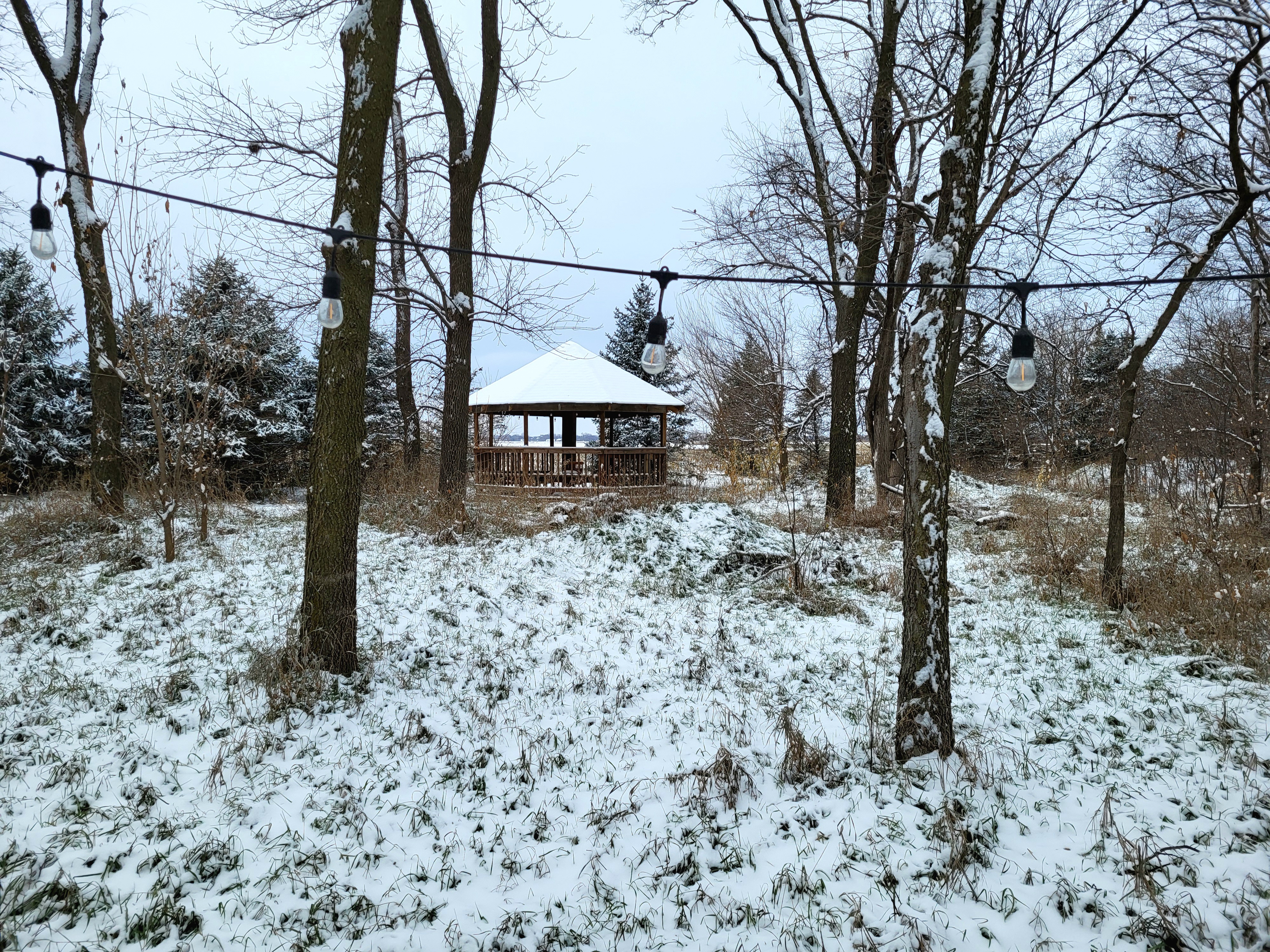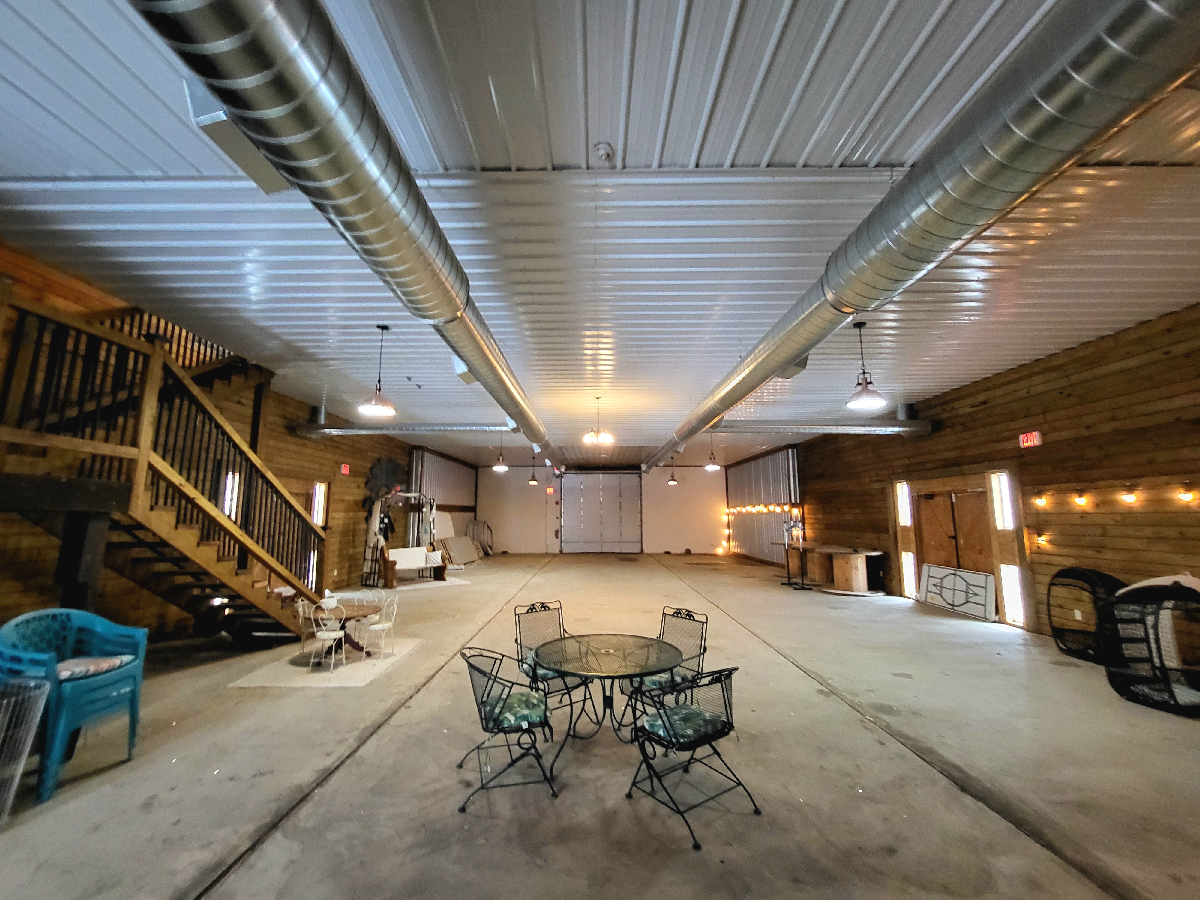 Photos above, clockwise from upper left: 1. The machine shed which can be set up for a dinner or dance. 2. Outdoors looking at the machine shed and the parking lot, which would be expanded, said Jorgensen. 3. Part of the grove of trees with the gazebo. 4. Jorgensen stands in the great room and part of the gourmet kitchen of the guest house. 5. The upper portion of the 114-year-old barn. The entire interior of the structure has been renovated into event space. — Photos by Gary Dickson