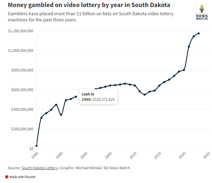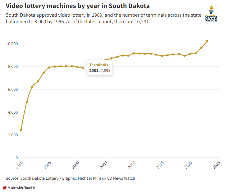 MADISON, S.D. – South Dakota keeps adding video lottery machines, with 567 more terminals and over $1.17 billion gambled this year, earning a record-setting $163 million in revenue for the state.