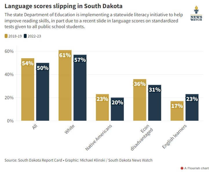 In the 2022-23 school year, English language arts proficiency was at 50 percent among all students in South Dakota, a drop from 54 percent in 2018-19, according to the South Dakota Report Card. Some districts, individual schools and specific student populations showed results that were far worse, however, with language proficiency rates last year at 31 percent for economically disadvantaged students, 23 percent among English-language learners, and 20 percent for Native American children.