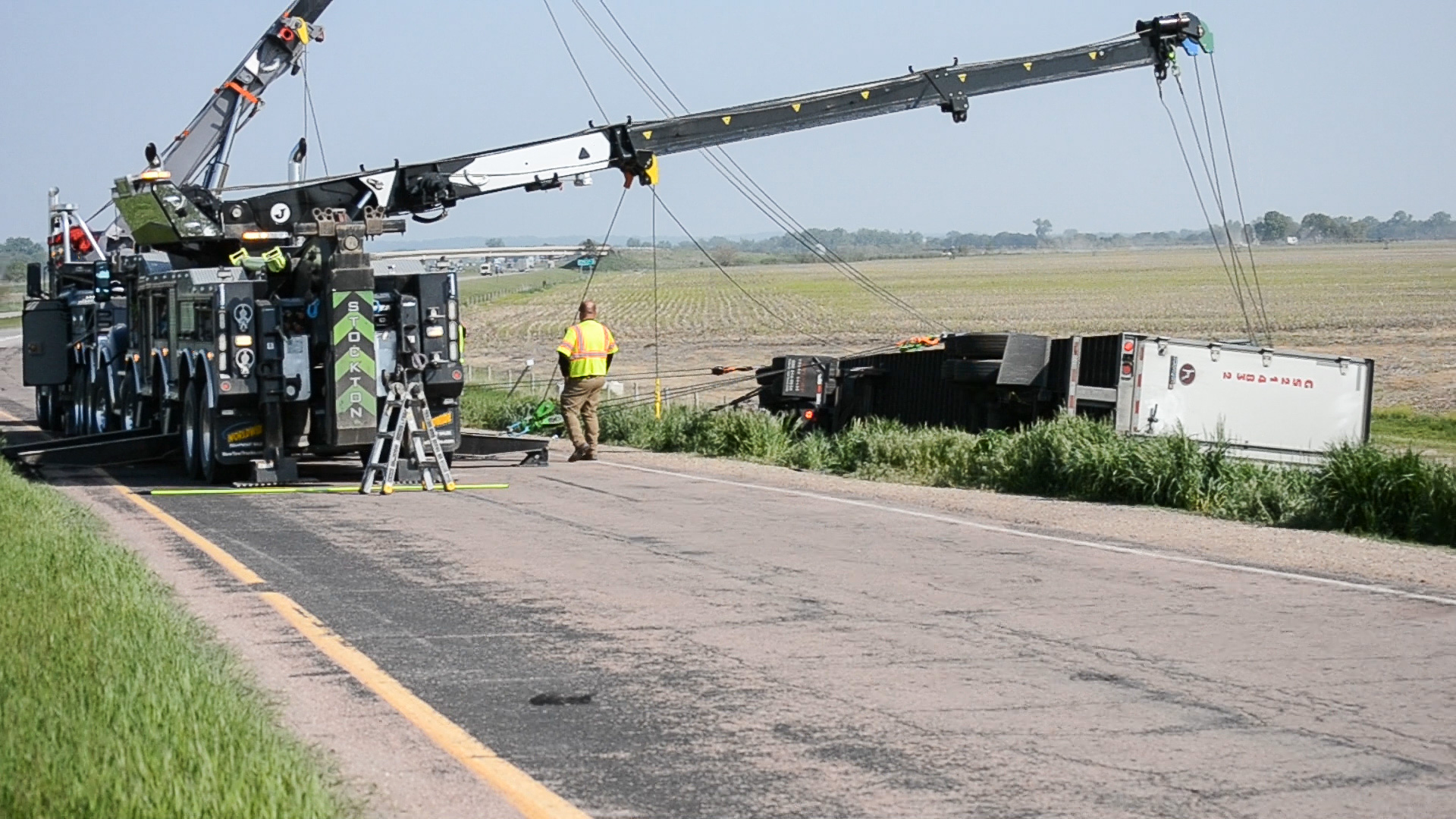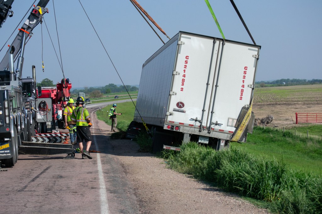 “I think this is gonna be expensive,” South Dakota Highway Patrol Officer Bryce Finnegan said looking over the wrecked semi and the three wreckers with their tow lines hooked up to it.