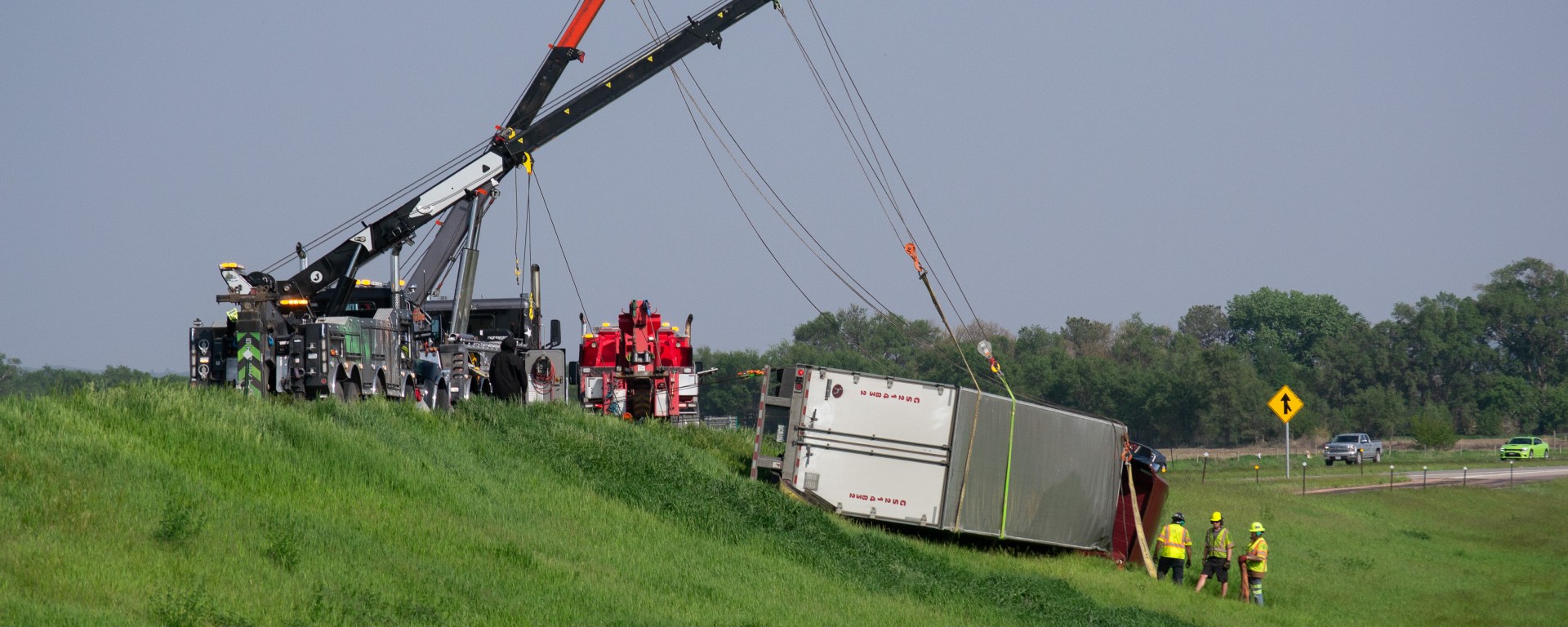 Three large wreckers were called in by the South Dakota Highway Patrol to work on getting the eighteen-wheeler pulled right-side up and back on the entrance ramp.