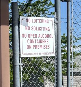 This sign, on the fence of a closed Whiteclay business, is a remnant of the village’s notorious past when street people drank openly on the streets and four stores sold up to 3.5 million cans of beer a year. (Paul Hammel/Nebraska Examiner)