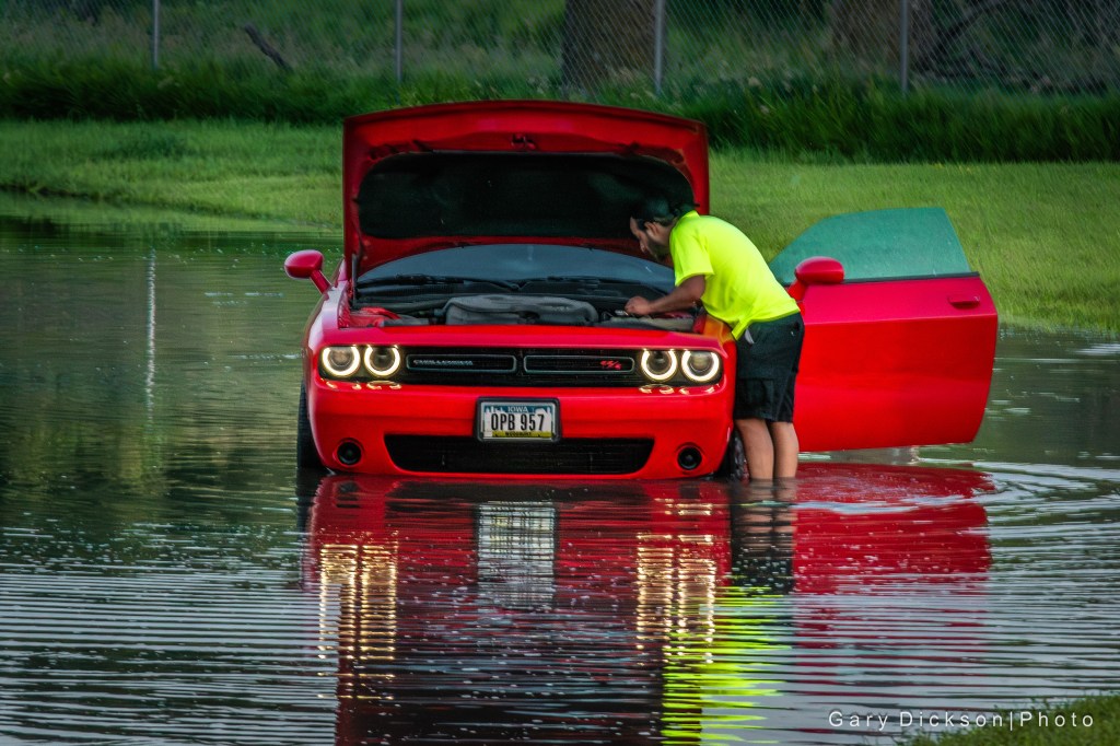 I was standing on the hill just downstream from the Missouri River Boat Club at the park taking photos of the flooding when someone pointed to the bright red Dodge Challenger making its way through the water-filled road below us. People started yelling at him to stop and go back, but he kept going slowly until his car stalled.