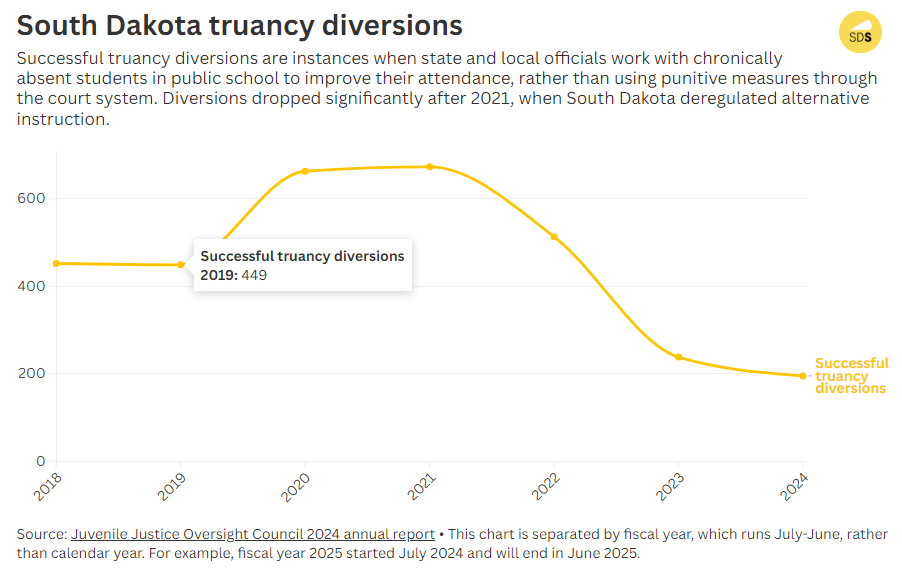 Recent truancy data has led critics to suspect some families who say they’re enrolled in alternative instruction are not educating their kids. The number of truancy diversions in South Dakota, which is a program to improve school attendance for absent children, nosedived from 513 during the fiscal year 2022 to 195 in 2024. The drop followed changes to state law in 2021 that made it easier to remove kids from public schools and enroll them in alternative instruction.