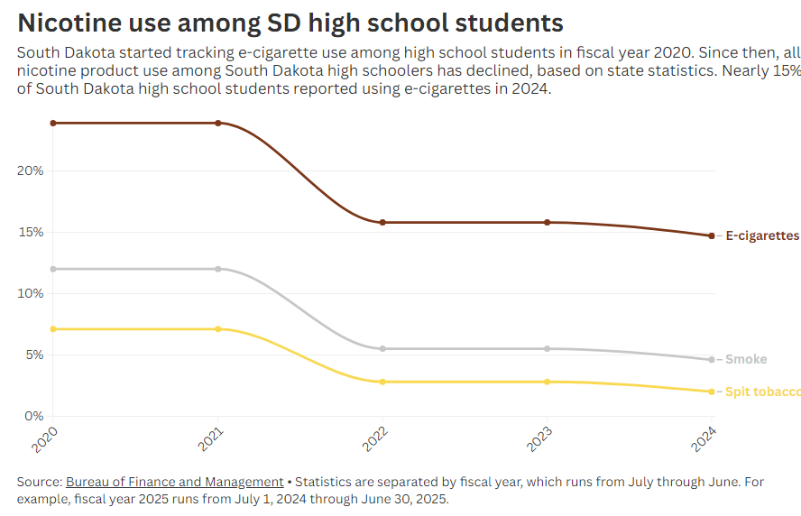 Between 2022 and 2023, the percentage of U.S. high school students reporting tobacco and nicotine product use — including e-cigarettes — declined from 16.5% to 12.6%, but the percentage among middle school students increased from 4.5% to 6.6%, according to the Centers for Disease Control and Prevention. In South Dakota, 14.7% of high schoolers reported using e-cigarettes last fiscal year, according to the Bureau of Finance and Management, which was three times higher than the percentage that reported smoking and seven times higher than the percentage that reported spit tobacco use.